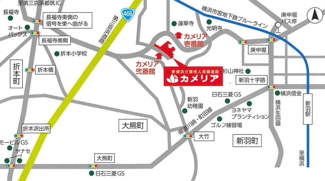 綱島駅より「新横浜駅行」「新羽駅行」を利用 「新羽営業所庚申堀バス停」徒歩10分