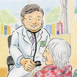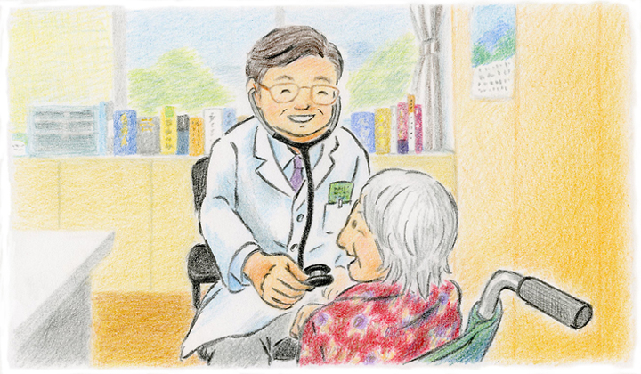 主な業務内容は、施設に入所中の方の健康管理や治療、短期入所者の入所時の診察、通所リハビリテーション(デイケア)ご利用者の診察、また訪問リハビリテーションを利用されておられる方の定期的な診察などに従事しています。