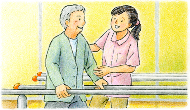 機能訓練室では、入所の場合週2〜3回、集中的に行う時期(入所から3ヶ月以内)の方には週6回の訓練日があります。必要に応じて家屋改造指導など、在宅生活の継続への支援も行っています。
